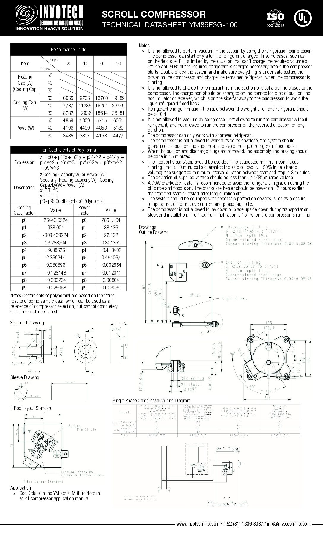 COMPRESSOR SCROLL YM86E3G-100 5HP-36,000 BTU/HR MED TEMP 220/1/60. KIT DE ARRANQUE INCLUIDO.