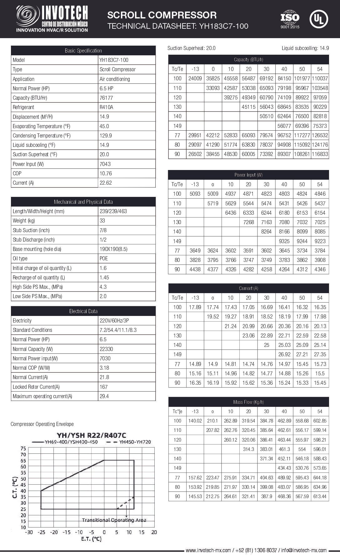 Compresor Scroll Invotech YH183C7-210 7hp A/c 220/3/60 R410
