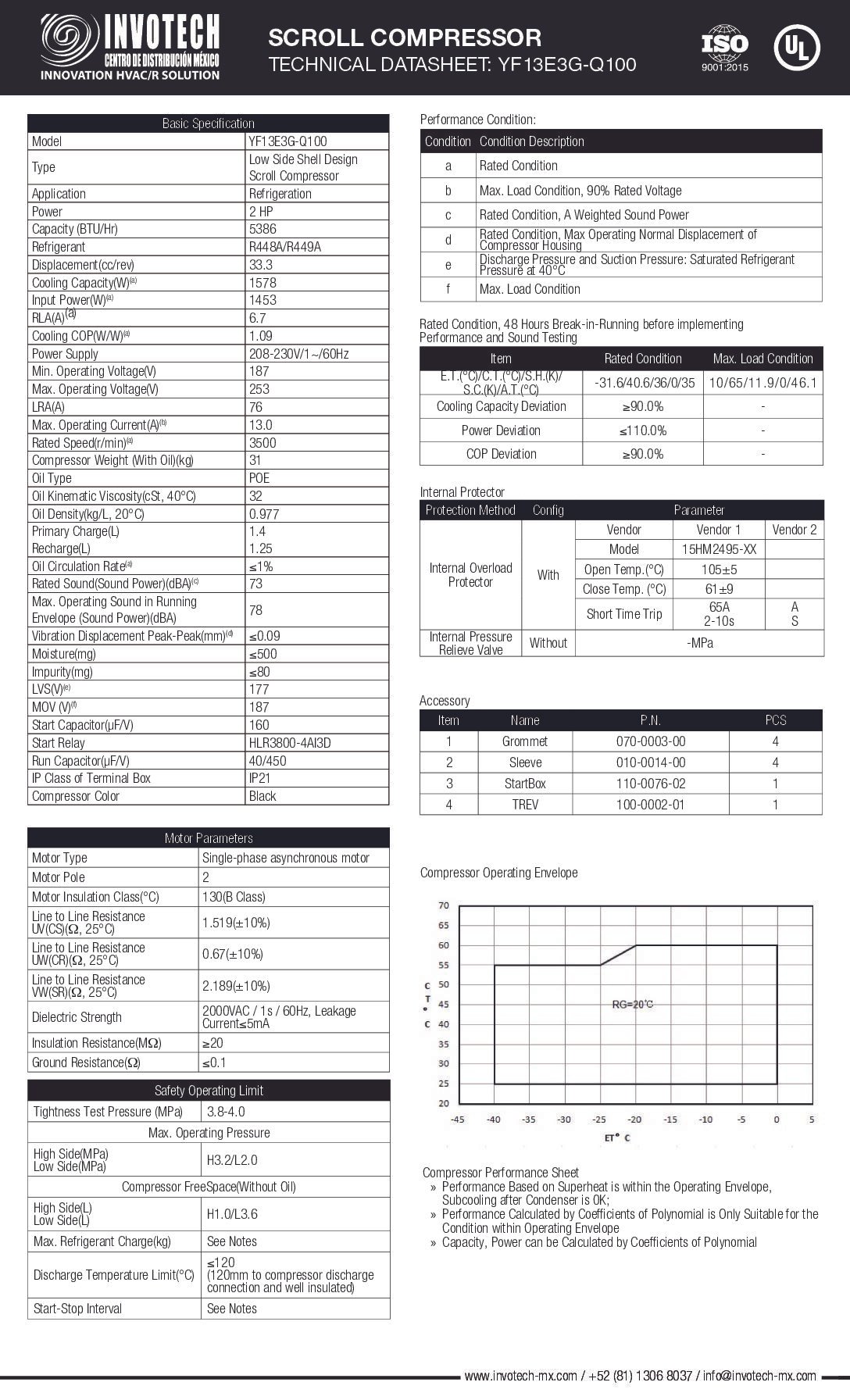 El Compresor Scroll YF13E3G-Q100 es un equipo de alta eficiencia diseñado específicamente para aplicaciones de refrigeración comercial de baja temperatura. Con su capacidad de 5,300 BTU/HR y motor de 2 HP, este compresor ofrece un rendimiento confiable y eficiente para sistemas de congelación que requieren operación en condiciones extremas de frío.