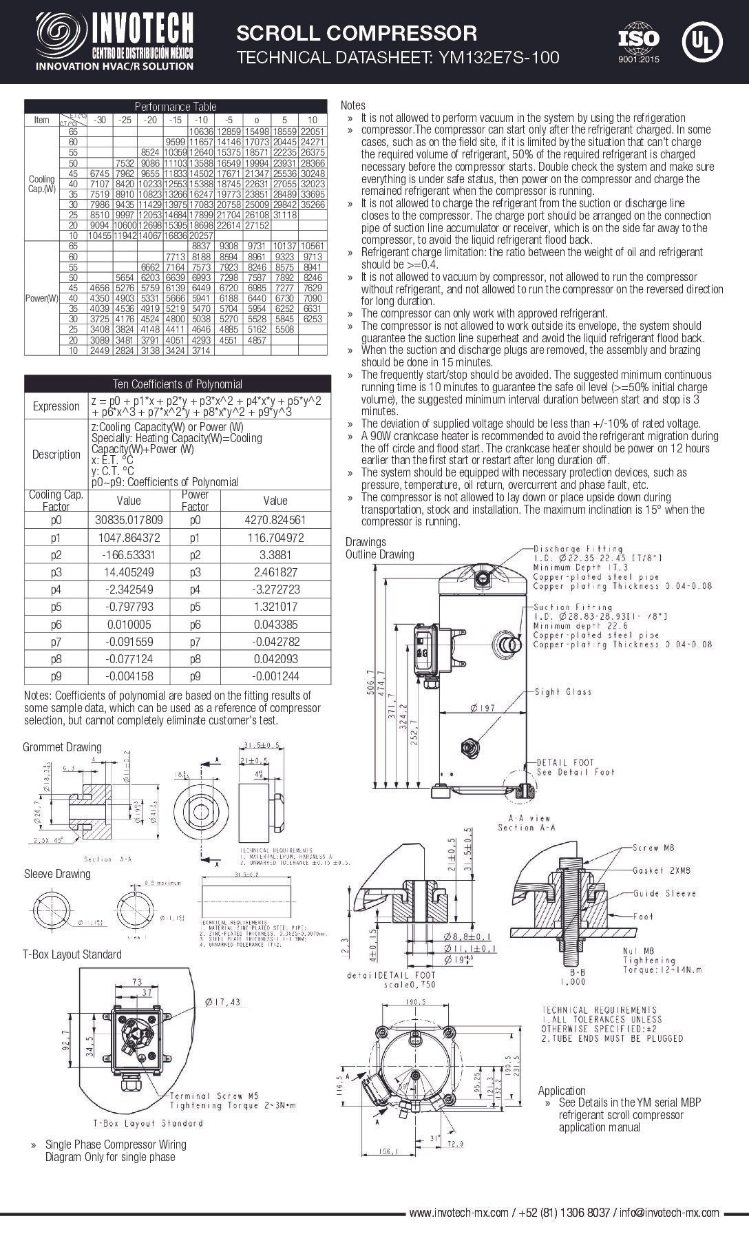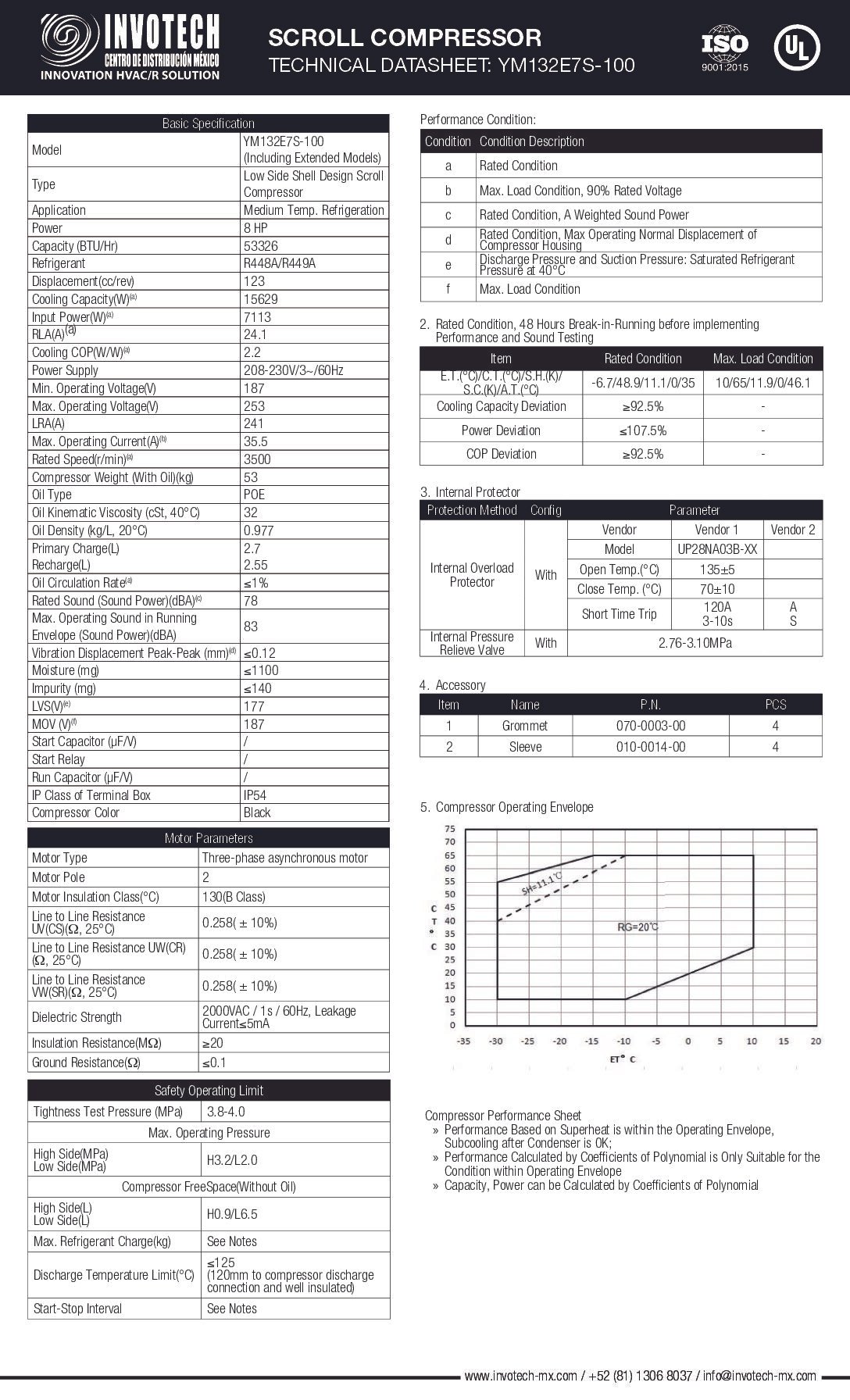 Compresor Scroll de Alto Rendimiento YM132E7S-100 | 8 HP – 56,000 BTU/HR – Media Temperatura