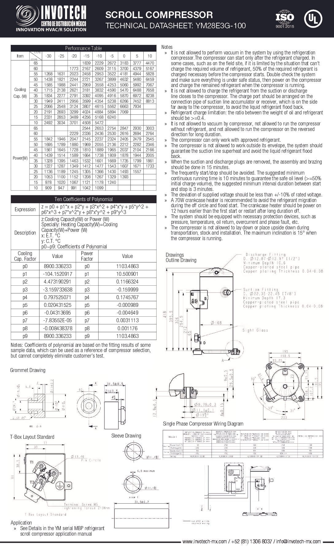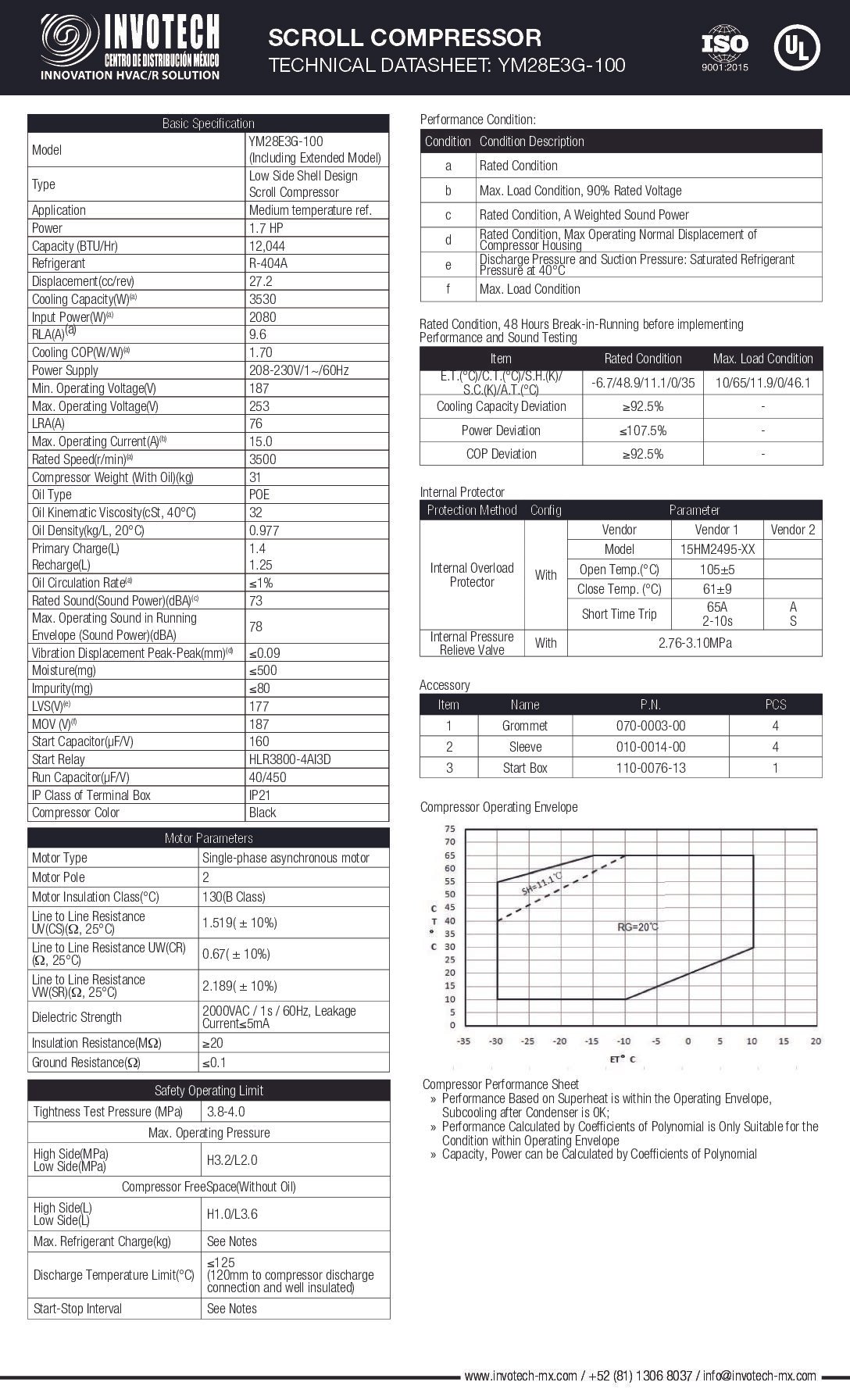 COMPRESSOR SCROLL YM28E3G-100 1.8HP-14,800 BTU/HR MED TEMP 220/1/60, KIT DE ARRANQUE INCLUIDO.