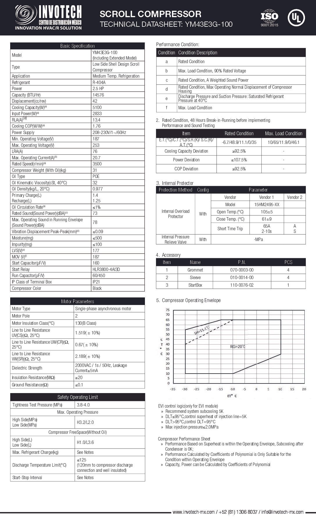 COMPRESSOR SCROLL YM43E3G-100 2.5HP-17,400 BTU/HR MED TEMP 220/1/60. KIT DE ARRANQUE INCLUIDO.